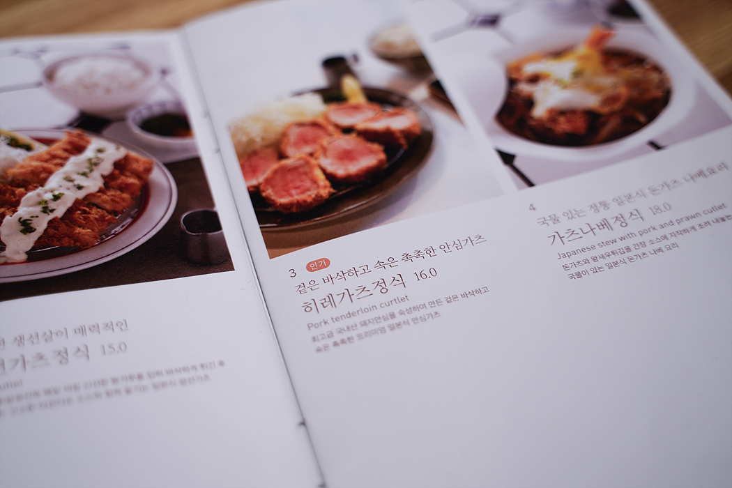 히레가츠정식, 스키야키정식, 연어스테이크정식, 로스가츠정식 시켰음.